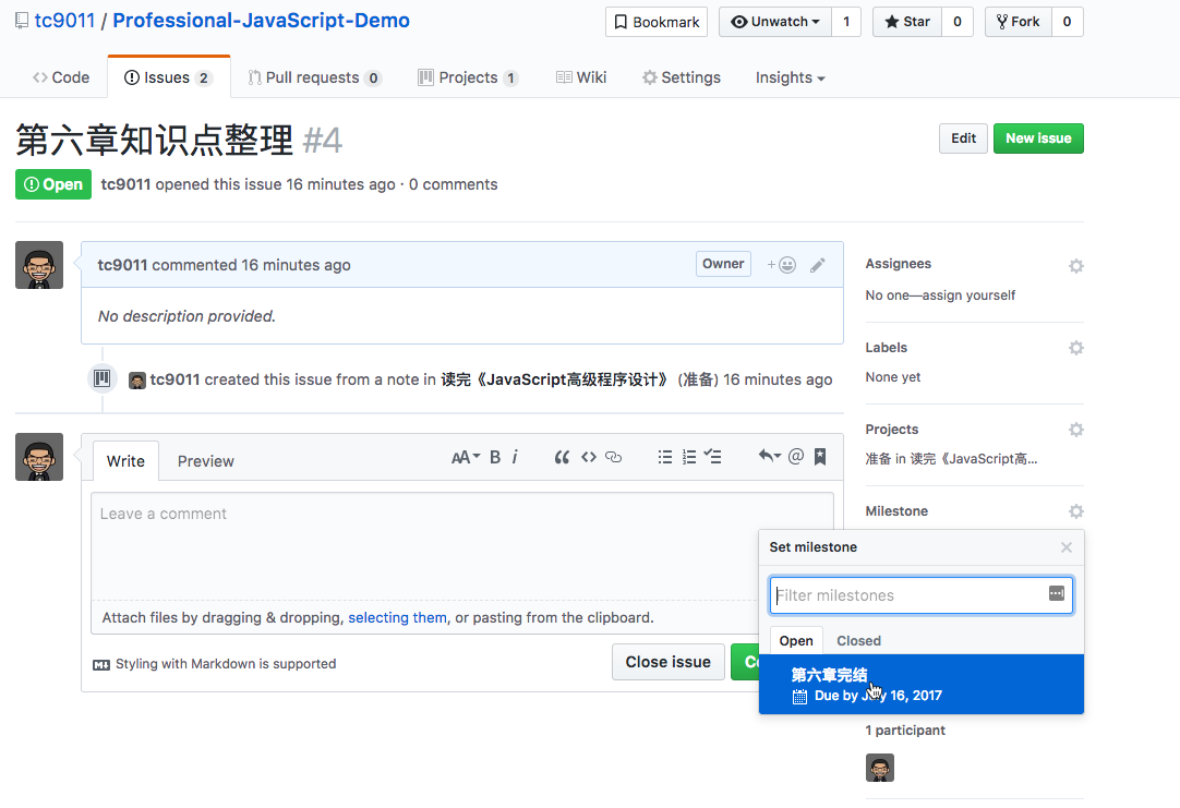 比如我现在Github上有一个叫Professional-JavaScript-Demo的仓库,这是我用来学习《JavaScript高级程序设计》的,这本书有25章节,共730页。假设现在我把每一章算作是一个迭代(也就是两周)任务,这个任务又分成读完整章和整理整章的知识点两部分。基于这个前提,下面我们就利用Github进行敏捷学习。